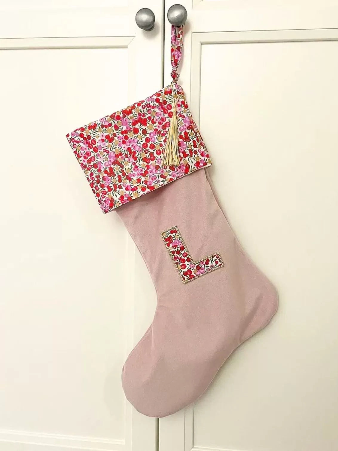 A beautiful handcrafted personalised velvet stocking, adorned with a Liberty London Christmas cuff and a bespoke embroidered appliqué initial and tassel detail.
