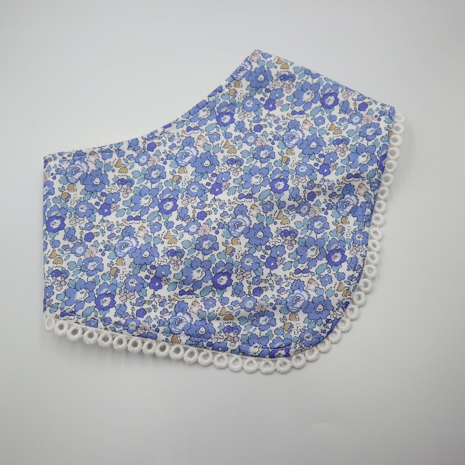 This Liberty London baby bib features the signature Betsy Ann Blue print on fine cotton Tana lawn, accented with a delicate lace trim. The reverse side is crafted from soft, organic bamboo towelling for gentle absorbency. Equipped with two nickle free adjustable Kam snap fasteners, the bib’s size can be easily adapted to grow with your baby, combining timeless style with practical functionality.